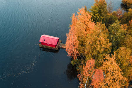 Old wooden boat house at a lake with wooden bridge. Lake and Boat shed