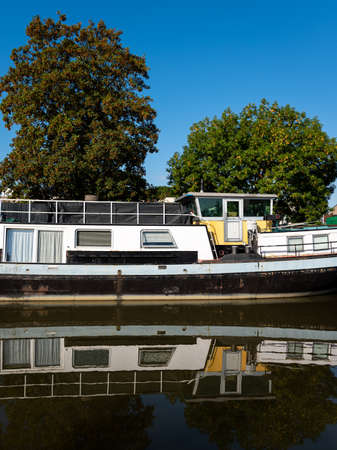 Nancy, France - September 7, 2020: Boats on a canal quiet sunny day in summer, blue sky, reflection in water