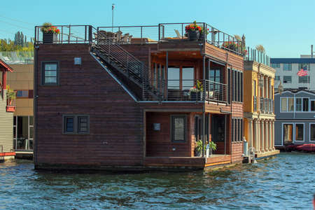 Downtown Victoria, Vancouver Island, British Columbia, Canada - August 17, 2021: Homes on the water at a Floating Pier in Fishermans Wharf Park. Sunny Summer Day.