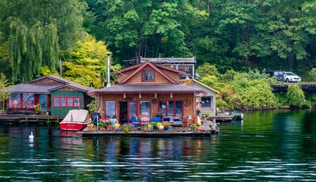 Flloating homes houseboats along Multnomah Channel in Portland Oregon in Fall Season
