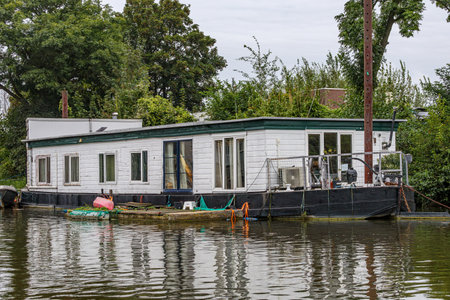 Houseboat with white walls and flat roof anchored on bank of shipping canal outside the city of Maastricht, with green trees in background, cloudy day in South Limburg, Netherlands