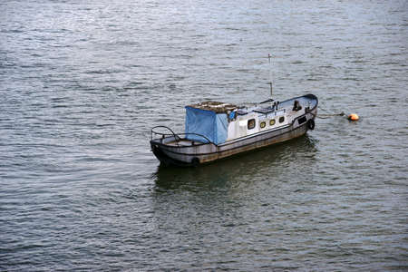 An old boat at sunrise by the river Sava under the Bridge of Liberty in Zagreb, Croatia, Europe