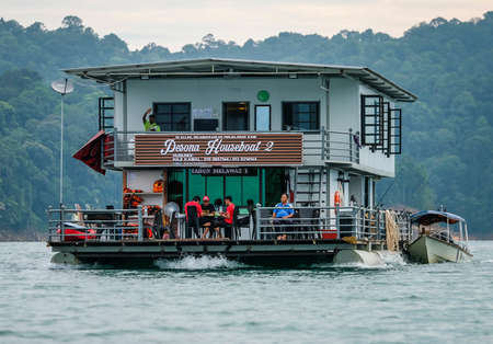 TERENGGANU. MALAYSIA - SEPTEMBER 15, 2019 : Beautiful houseboat crusing through the lake with mountain view at Kenyir Lake. Kenyir Lake also known as Tasik Kenyir, it is the largest man-made lake in South East Asia with an area of 260,000 hectares.