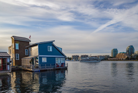 Colorful floating homes and modern buildings line the waterfront wharf in Victoria, BC, Canada
