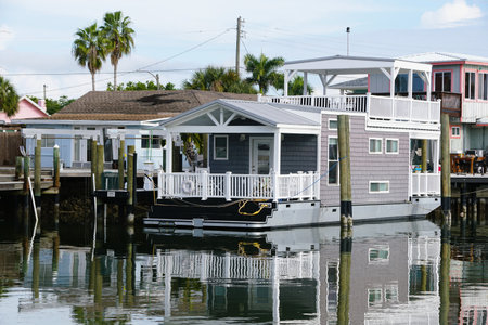 A two-story gray houseboat with white railings is moored alongside a dock, exhibiting a clear, slightly rippled reflection on the calm water near St Petersburg, Florida, U.S.A