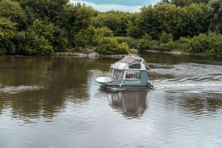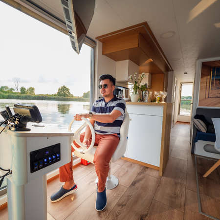 Summer vacation travel on barge boat or houseboat on a river, man by steering wheel on river cruise trip in a houseboat