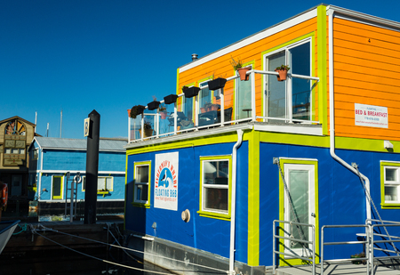 VICTORIA BC CANADA FEB 12, 2019: Victoria Inner Harbour, Fisherman Wharf is a hidden treasure area. With colorful floating homes, gifts, food and wildlife watching eco tours.