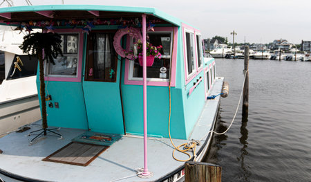 Babylon, New York, USA - 29 June 2019: Close up of a front view of a tropical colored houseboat moored in a marina with welcoming house plants hanging by the doot.