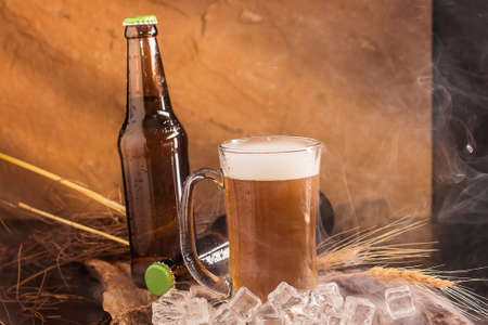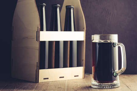 beer bottles case and mug on a dark background/beer bottles case and mug on a dark background. Selective focus