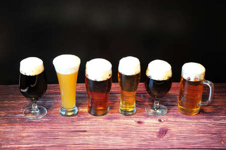 Six different glasses with different types of beer are in a row on a wooden table. Close-up.