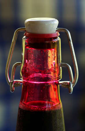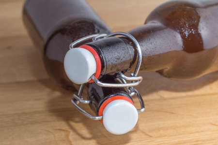 Two chilled brown beer bottles with wire cap lids and condensation lying on their side on a wooden counter, close up view of the overlapping necks of the bottles with stopper detail