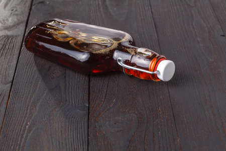 Homemade tincture of red cherries in a glass bottle on a gray background, close-up. The concept of berry alcoholic beverages