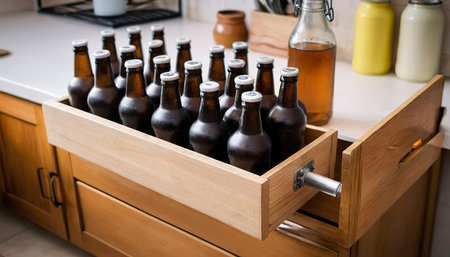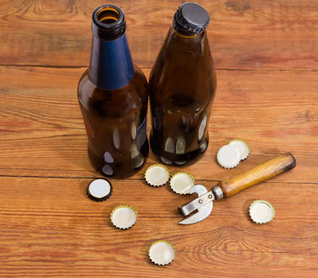 Beer bottle and their caps on a wooden drawer in the kitchen