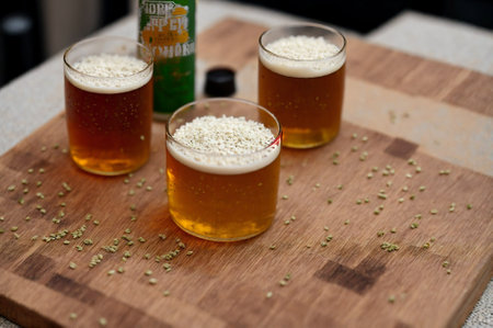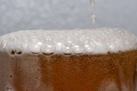 Fresh cold light beer is poured into a glass next to an empty green bottle close-up macro photography
