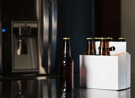 Six pack of brown beer bottles in plain white cardboard carrier with copy space on stainless steel kitchen or bar counter