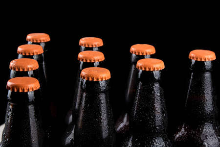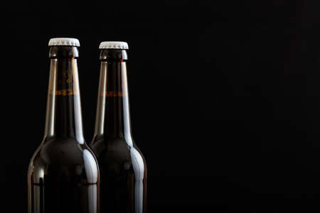 Cold beer bottles on black background, copy space. Fresh cold beer for choice.