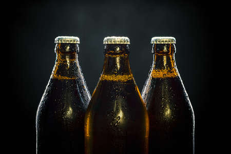 Three bottle of beer on a dark background/Three bottle of beer on a dark background, selective focus and copyspace
