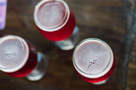 Three glasses with red wine on a wooden table. Glasses of cherry beer are on the table. A group of people drinks at the bar. There is no one in the frame.