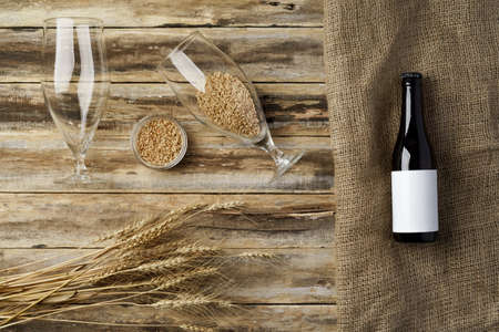 Beer bottles made from various malted grain, flat lay. Craft beer brewing from grain barley malt. Ingredients for brewers.