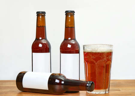 Bottles of beer on a brown wooden background with a red stopper four bottles