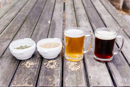 Close-up two cold beers with foam and water drops on old wooden table outdoor with sun beam