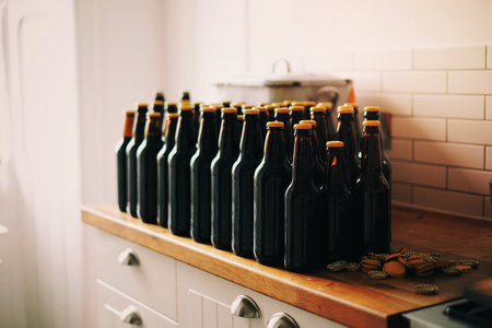 draught beer in bottles close-up. Beer bar on international beer day. Brewing at home.Draught beer stores