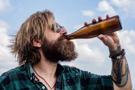 male bachelor lifestyle. bearded man drink beer. handsome brutal man. time to relax. mature hipster with beard drinking beer. brutal caucasian hipster with glass water bottle. just one sip