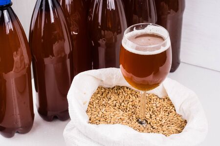 homemade beer from a plastic bottle is poured into a glass against the background of other beer bottles. Craft beer brewing from grain barley pale malt.