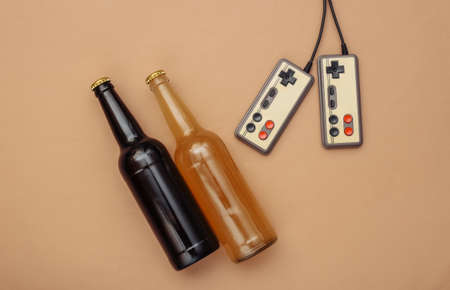 entertainment time. Gamepads and beer bottles on brown background. top view
