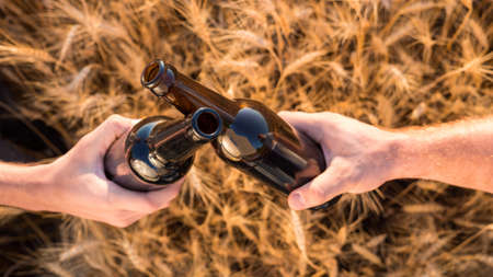 Happy. Hands of friends, colleagues during beer drinking, having fun, clinking bottles, glasses together. Flyer with copyspace. Oktoberfest, friendship, togetherness, happiness holidays concept