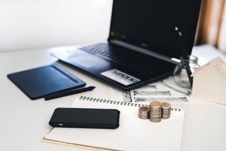 Office desk and coins, books and computers on the desk