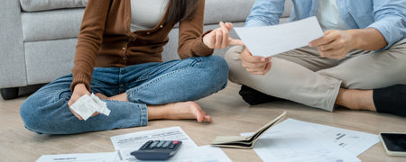 Stress asia couple man and woman use calculator for calculate family budget, debts, expenses during financial economic crisis at home at night. Marriage money trouble, Family budget plan concept.