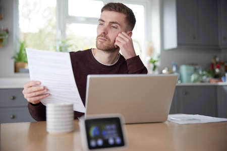 Smart Energy Meter In Kitchen Measuring Electricity And Gas Use With Man Looking At Bills