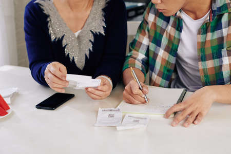 Cropped image of family checking bills and expenses and taking notes in textbook