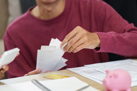 Budgeting and Financial Organization. A young man reviews bills and receipts while managing his finances.