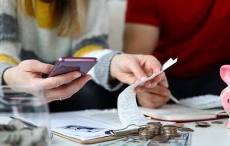 Close-up view of woman looking through checks and calculating expenses. Plastic card and coins laying on desktop. Man planning family budget. Economy concept