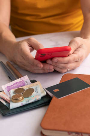 Close-up of person accounting money on mobile phone. Banknotes and coins on table. Detailed shooting. Family budget. Saving up. Finance and investment concept