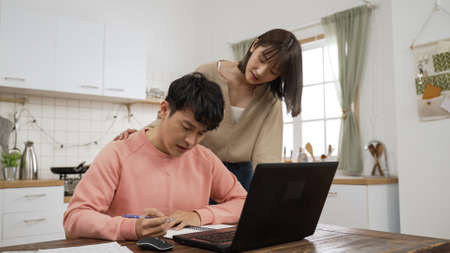 frustrated Asian man managing family finances and doing research on computer at dining table. his wife walking over to cheer him up while he is writing in notebook
