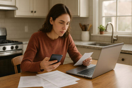 Focused woman using a smartphone and laptop to manage online bills at a kitchen table, surrounded by paperwork, in a modern home setting