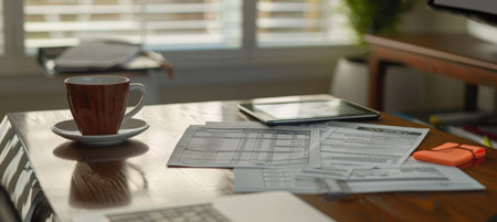 Organized Home Office Setup with Tax Forms and Coffee for Efficient Accounting