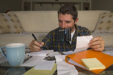 home lifestyle accounting portrait of young attractive and relaxed man counting monthly expenses and payments doing paperwork bills and calculator in domestic finance concept