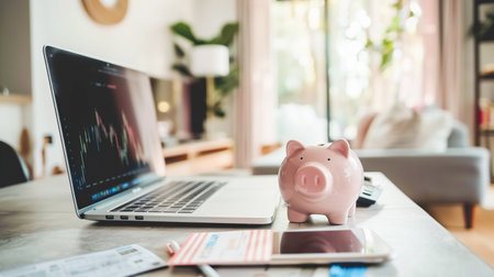 Home budget planning with piggy bank, home office with laptop displaying charts and piggy bank highlighting saving, budget management