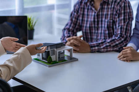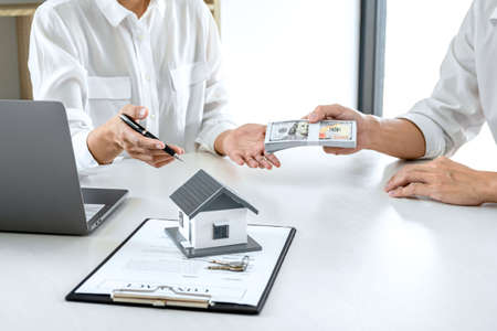 Real-estate agent sign for home contract property for sale in the office with buyer.