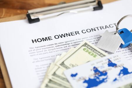 Contract for the purchase of a house. The real estate agent holds the keys. house model and dollars. Property investment. buying, renting and selling apartments. realtor