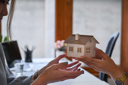 Housing Loan and Real Estate Broker Selling Agency Concept. Human Palms Hands is Holding House Model Offer to Customer for Sale,Rent. Business House Realty Agent and Residential Investment.