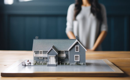 Real estate realtor or broker giving a house model with agent and customer discussing for contract to buy, get insurance or loan real estate or property