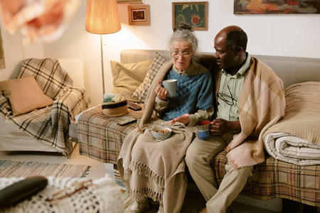 Senior Caucasian woman and senior Black man sitting together on sofa wrapped in blankets, holding mugs, sharing quiet moment in modest living room, looking slightly off camera