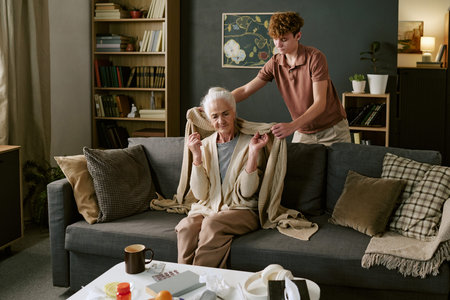 Senior woman sitting on sofa being covered with blanket by teenage boy in living room, both interacting with each other, bookshelves and decor in background