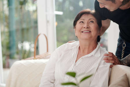 Asian matue woman sitting on sofa smiling and talking to her elder son at home