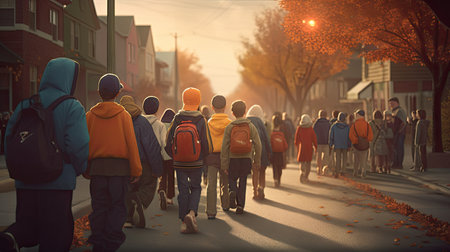 People walking at city street, aerial view. Protesting crowd. Generative AI